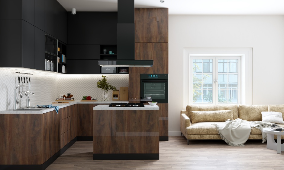 Island modular kitchens are available in different materials, including MDF, particle board, and solid wood, and are available in a range off finishes, including high gloss, matte, and wood grain.